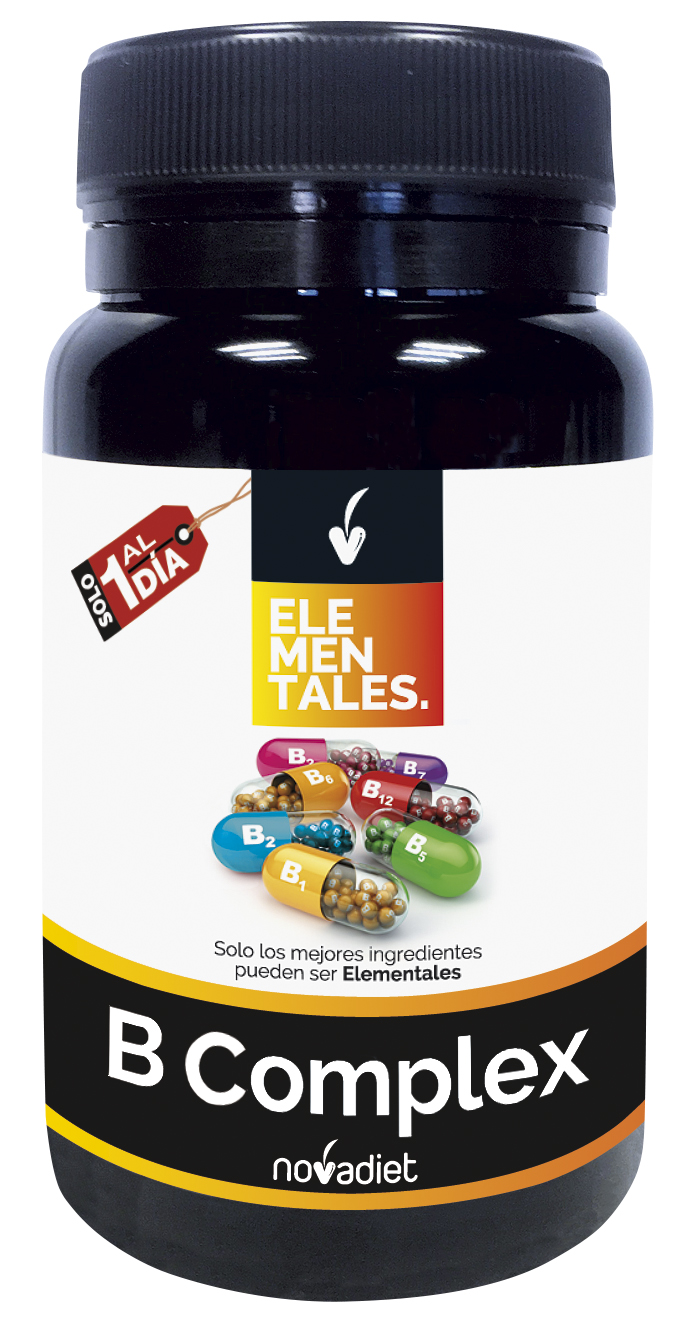 Agente de carga (celulosa microcristalina), Vitaminas B3 (nicotinamida, 48 mg, 300%*), B5 (D-pantotenato cálcico, 18 mg, 300%*), B1 (clorhidrato de tiamina, 3,3 mg, 300%*), B2 (riboflavina, 4,2 mg, 300%*), B6 (clorhidrato de piridoxina, 4,2 mg, 300%*), D-biotina (150 μg, 300%*), Ácido fólico (ácido pteroilmonoglutámico, 600 μg, 300%*), B12 (cianocobalamina, 7,5 μg, 300%*), Antiaglomerantes (sales magnésicas de ácidos grasos, dióxido de silicio). Cubierta: Hidroxipropilmetilcelulosa.