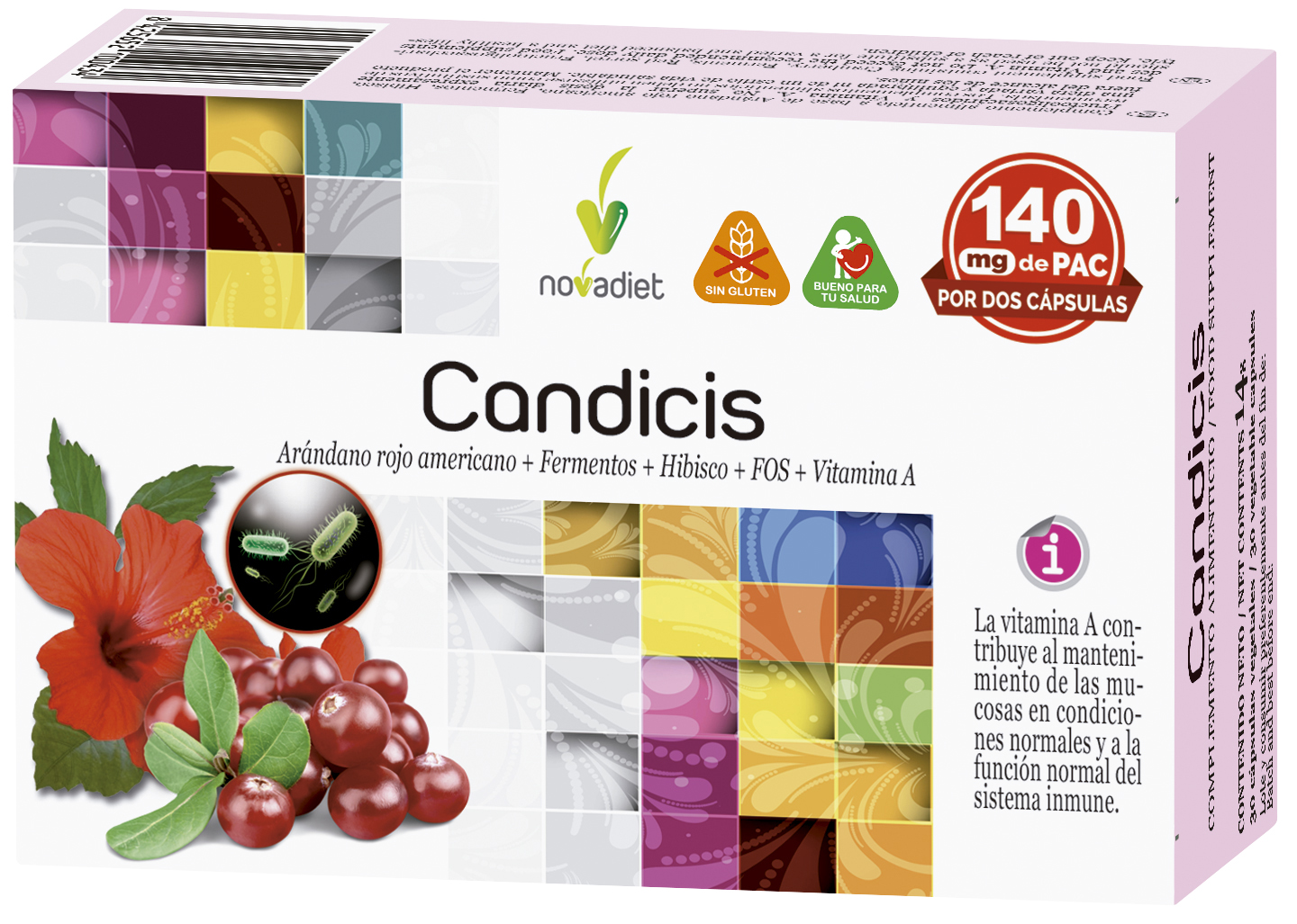 Hibisco, Arándano rojo americano [Vaccinium macrocarpon E.S., titulado al 50% en Proantocianidinas (PACs)], Fructooligosacáridos (FOS), Agente de carga (celulosa microcristalina), Probióticos (Lactobacillus rhamnosus, Lactobacillus reuteri) (leche), Antiaglomerantes (sales magnésicas de ácidos grasos, dióxido de silicio), Vitamina A (acetato de retinilo).