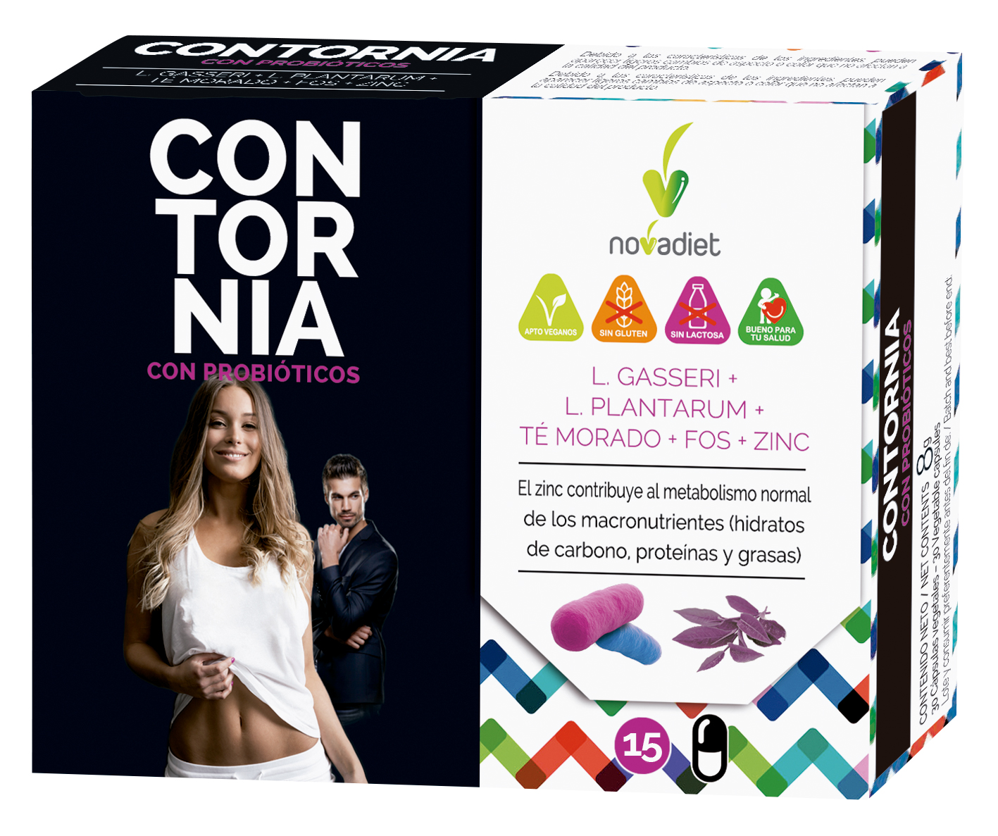 Té morado (E.S. titulado al 3% en GHG), Fructooligosacáridos (FOS), Lactobacillus gasseri, Agente de carga (celulosa microcristalina), Lactobacillus plantarum, Antiaglomerantes (sales magnésicas de ácidos grasos, dióxido de silicio), Cinc (sulfato de cinc). Cubierta: Hidroxipropilmetilcelulosa, Colorante (carbonato de calcio).