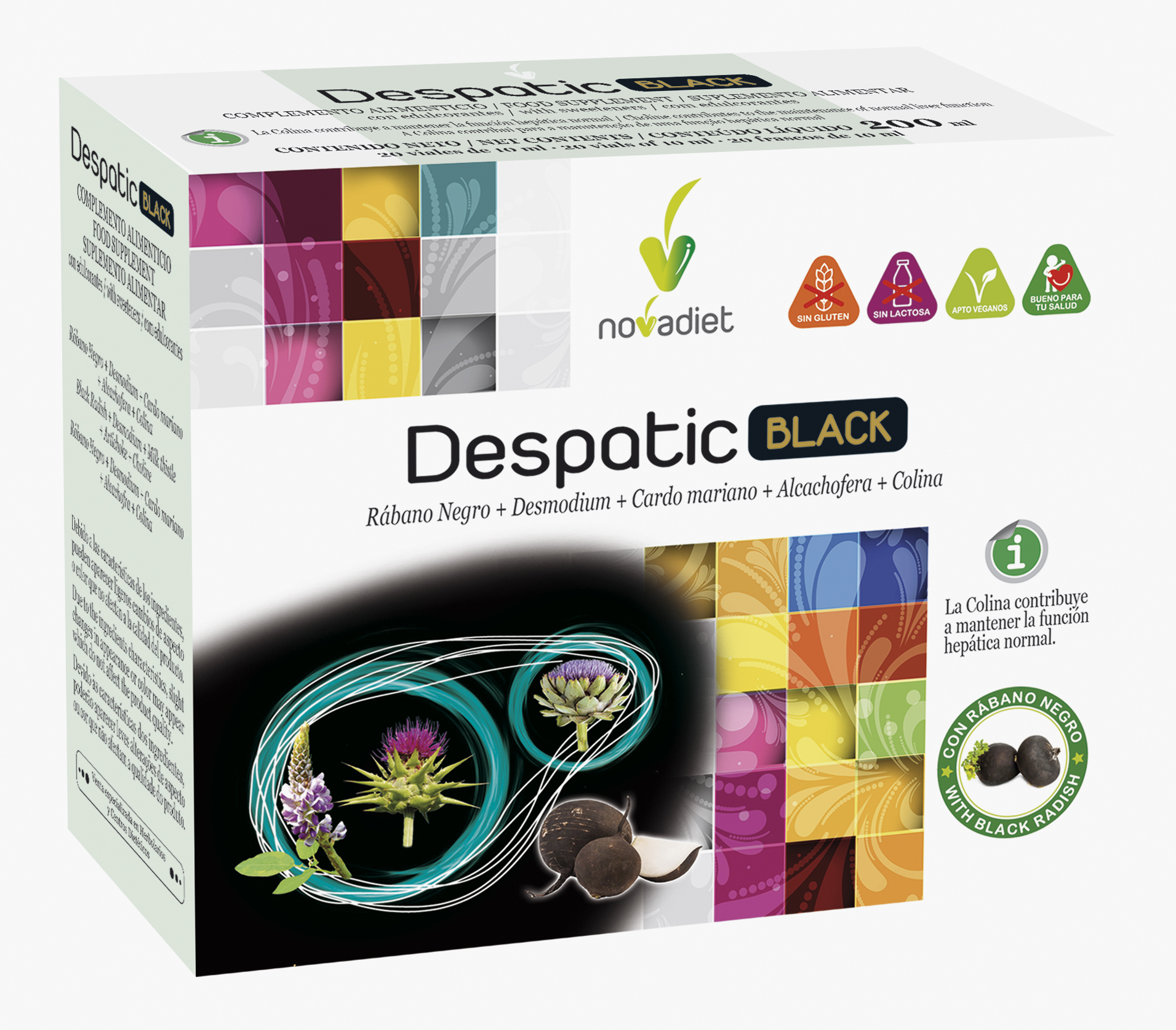 Agua, Alcachofera (E.S., titulado a > 5% en cinarina), Cardo mariano (E.S., titulado a > 80% en silimarina), Citrato de colina, Rábano Negro (E.S., ratio 4:1), Desmodium (E.S., ratio 5:1), Zumo de limón, Aroma, Acidulante (ácido cítrico), Conservador (sorbato potásico), Edulcorantes (glucósidos de esteviol, sucralosa).