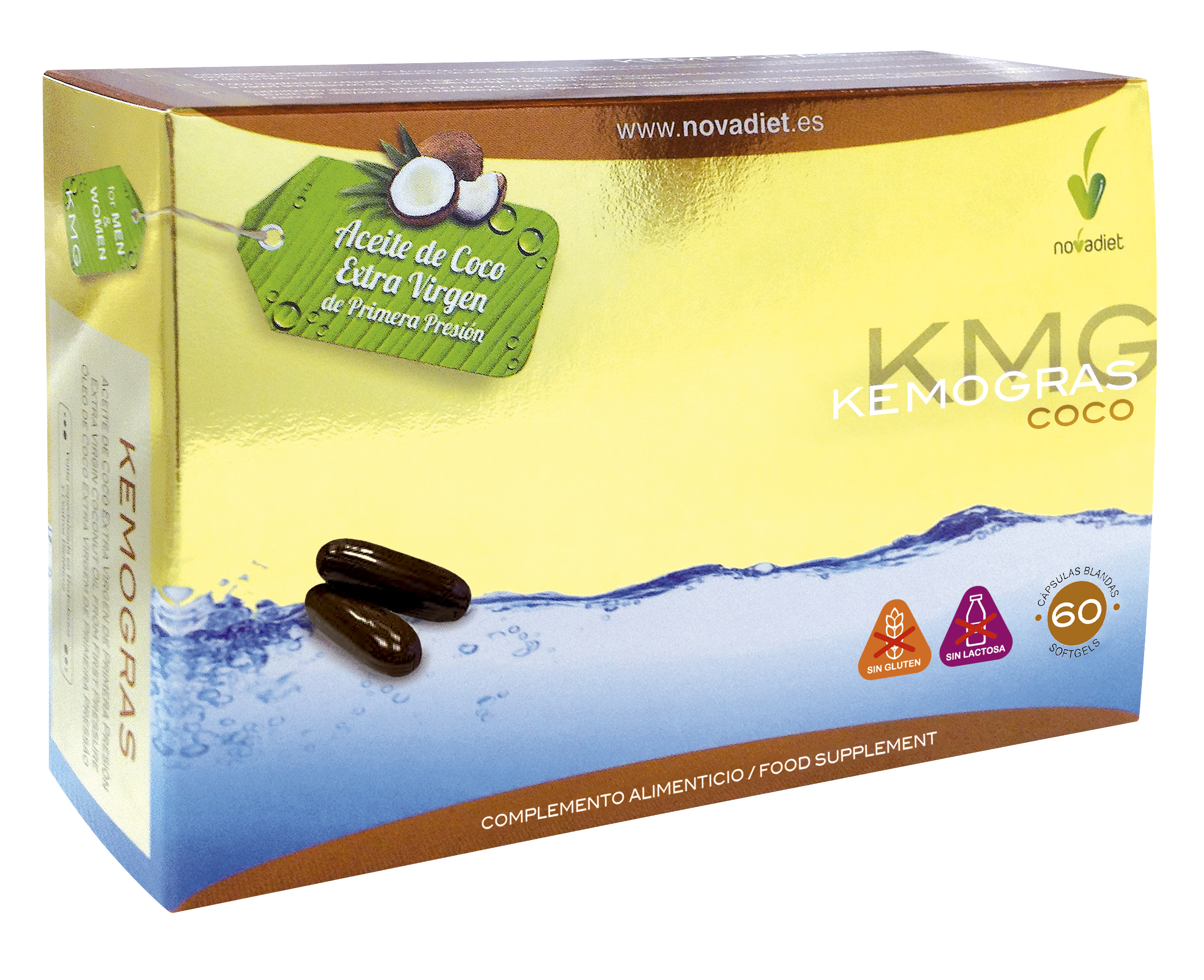 Aceite de Coco Ecológico Extra Virgen de Primera Presión. Cubierta: Gelatina, Glicerina, Agua y Colorantes (óxido de hierro negro y rojo).