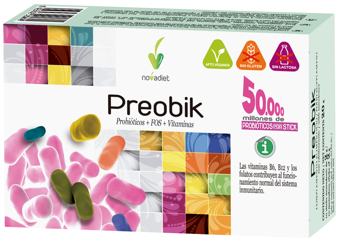 Agente de carga (maltodextrina), Fructooligosacáridos (FOS), Edulcorante (sorbitol), Aroma, Probióticos (Bifidobacterium bifidum, Lactobacillus acidophilus, Lactobacillus rhamnosus, Lactobacillus plantarum, Bifidobacterium breve, Bifidobacterium longum, Lactobacillus casei, Lactobacillus lactis, Lactobacillus bulgaricus, Lactobacillus salivarius), Vitaminas B3 (ácido nicotínico), B5 (D-pantotenato cálcico), D-Biotina, B12 (cianocobalamina), Ácido fólico (ácido pteroilmonoglutámico), B6 (clorhidrato de piridoxina), B2 (riboflavina), B1 (mononitrato de tiamina).