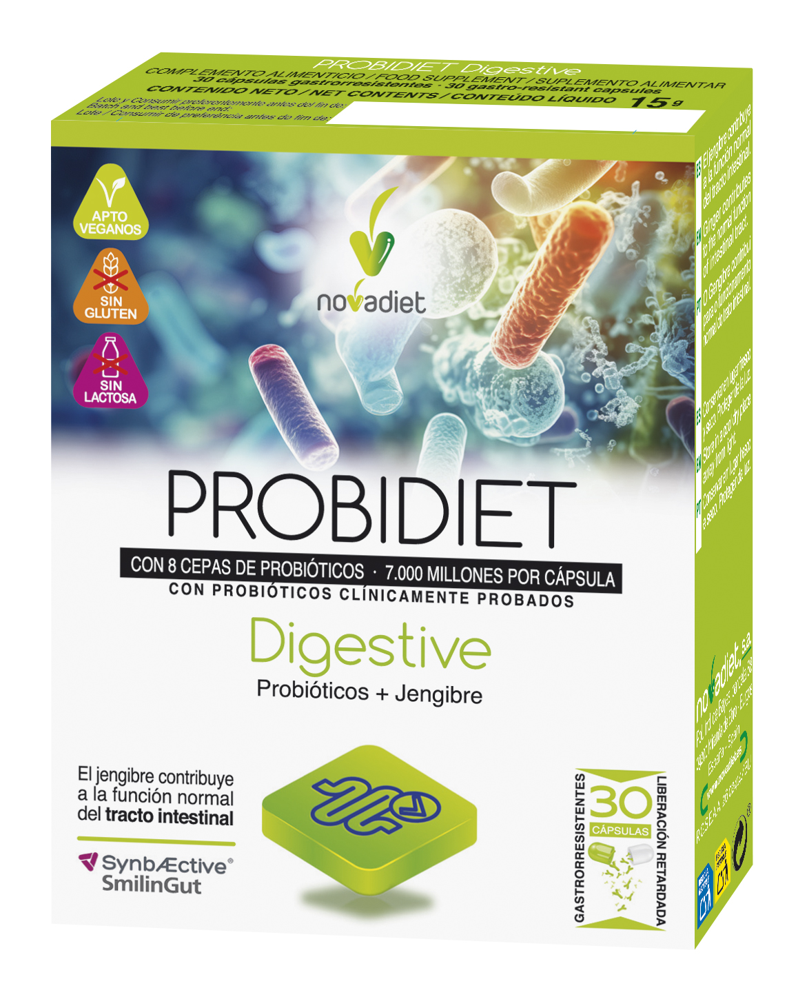 Almidón de maíz, Jengibre (E.S., ratio 50:1, titulado al 5% en gingerol), SynbÆctive® SmilinGut (Lactobacillus plantarum PBS067/DSM24937, Lactobacillus rhamnosus LRH020/DSM25568, Bifidobacterium lactis BL050/DSM25566), Antiaglomerante (sales magnésicas de ácidos grasos), Lactobacillus acidophilus CCTCC M 2013337, Lactobacillus fermentum PBS073/DSM 25176, Lactobacillus gasseri CCTCC M 2019829, Lactobacillus reuteri CCTCC M 2013692, Bifidobacterium breve CCTCC M 2013687.