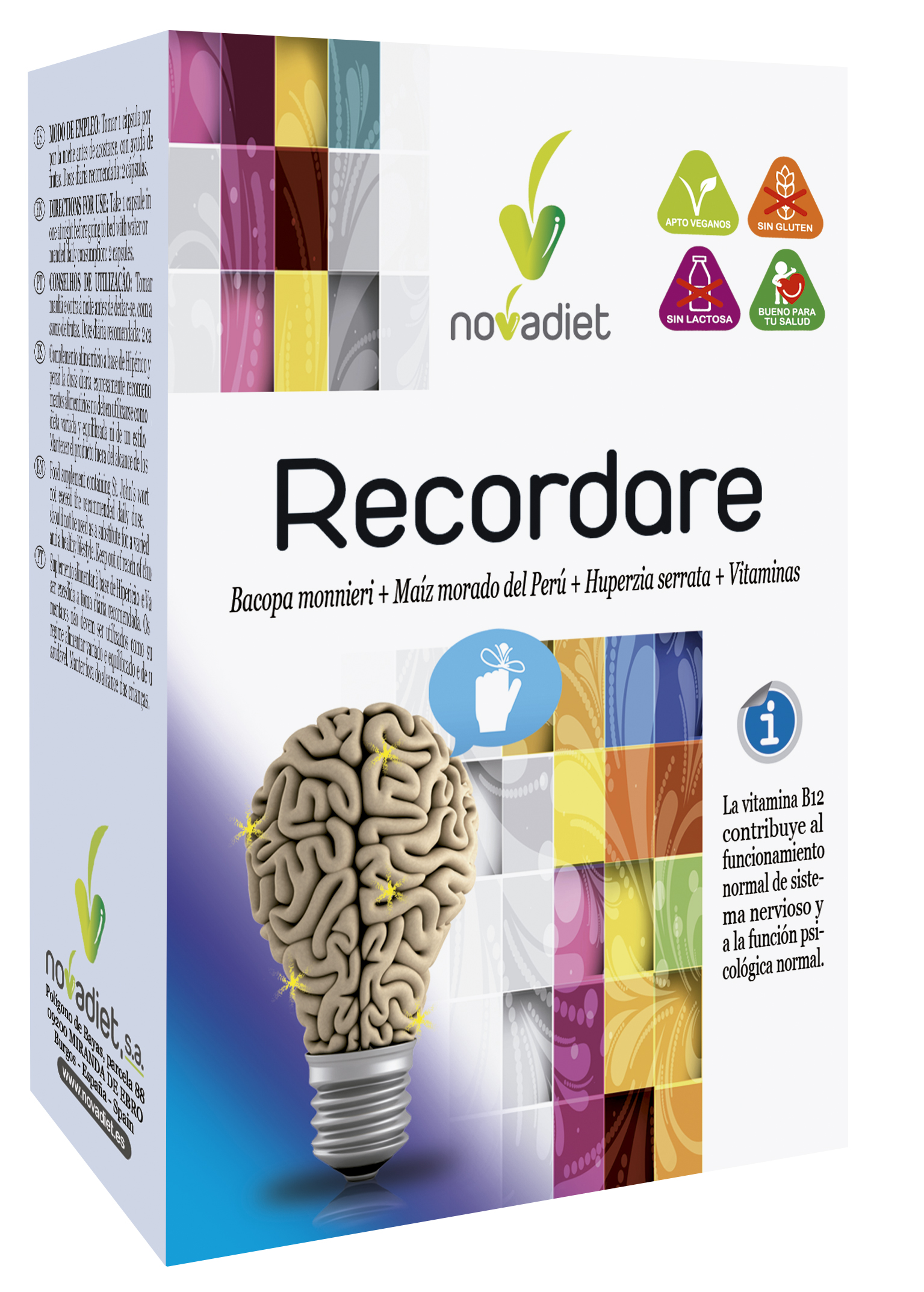 Bacopa monnieri (E.S., titulado al 20% en bacósidos), Maíz morado del Perú (E.S, ratio 10:1), Maltodextrina, Huperzia serrata (E.S., titulado al 1% en huperzina A), Ácido fólico (ácido pteroilmonoglutámico), Vitamina B12 (cianocobalamina), Antiaglomerantes (sales magnésicas de ácidos grasos, dióxido de silicio). Cubierta: Agua, Hidroxipropilmetilcelulosa.